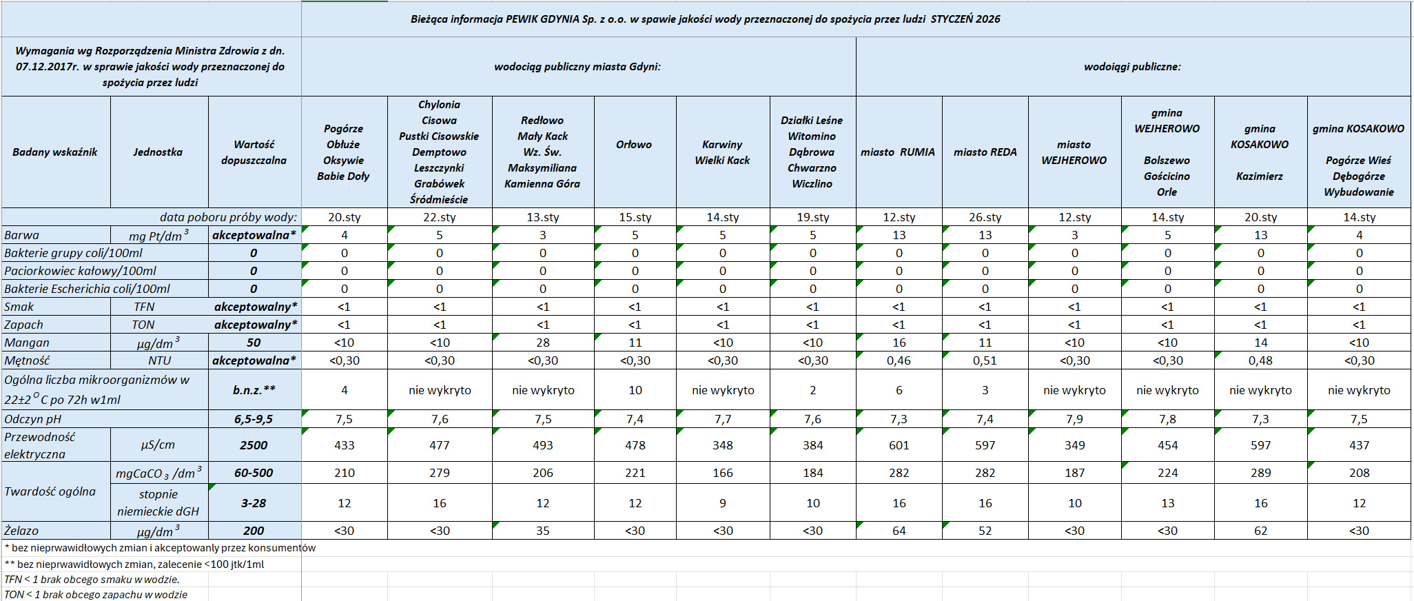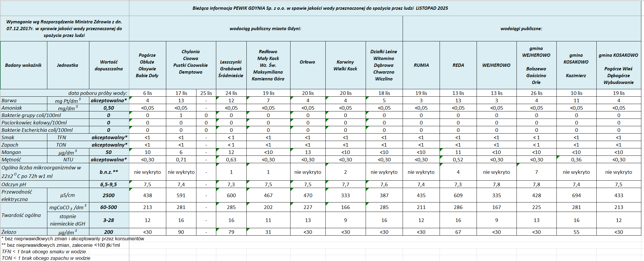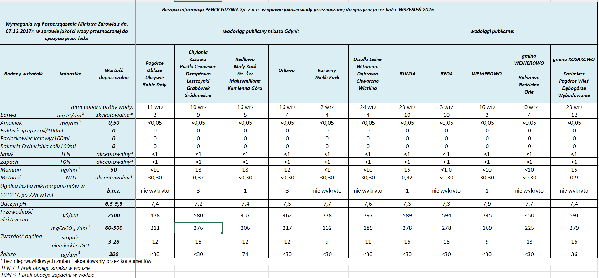 Tabela jakości wody w Rumi, Redzie, Wejherowie, Gminie Wejherowo i w Gminie Kosakowo w I półroczu 2025 r.